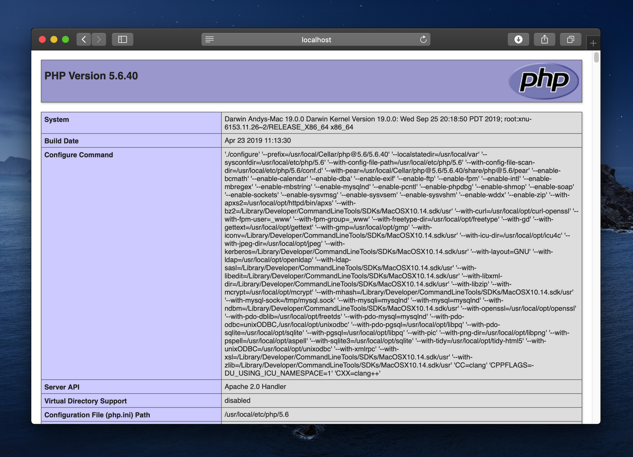 If you see a similar phpinfo result, congratulations! You now have Apache and PHP running successfully. You can test the other PHP versions by commenting the LoadModule ... php@5.6 ... entry and uncommenting one of the other ones. Then simply restart apache and reload the same page.