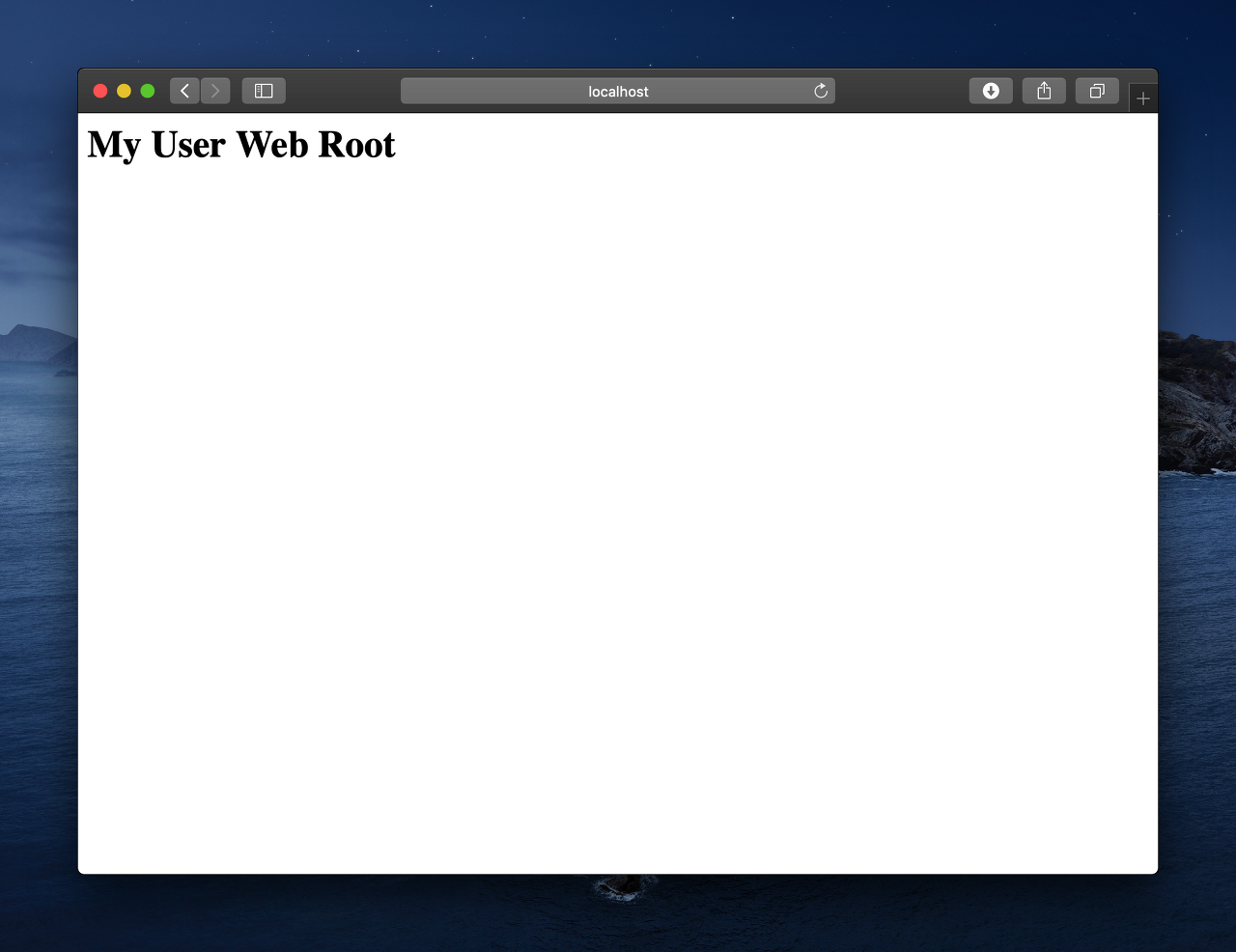 $ mkdir ~/Sites $ echo "<h1>My User Web Root</h1>" > ~/Sites/index.html