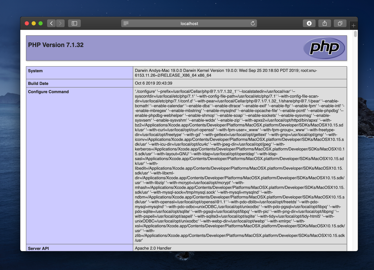 Test to see if your Apache is now running PHP 7.1 by again pointing your browser to http://localhost/info.php. With a little luck, you should see something like this: