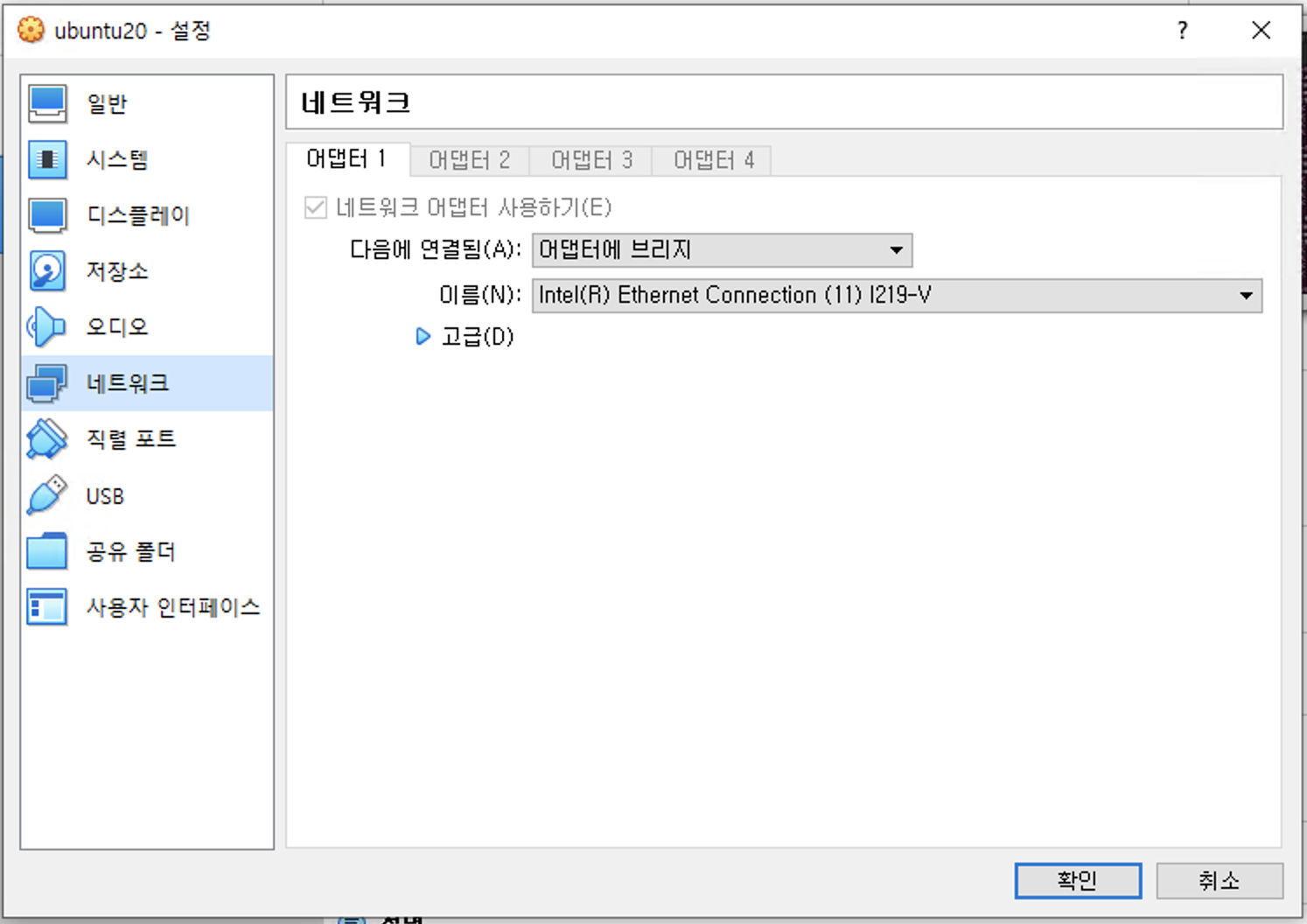VM 의 네트워크를 어댑터에 브릿지 로 설정