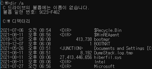 C:\ 에서 dir /a 를 해보면 위의 그림과 같이 엄청나게 큰 파일이 있다. 대략 27GB 정도 된다.