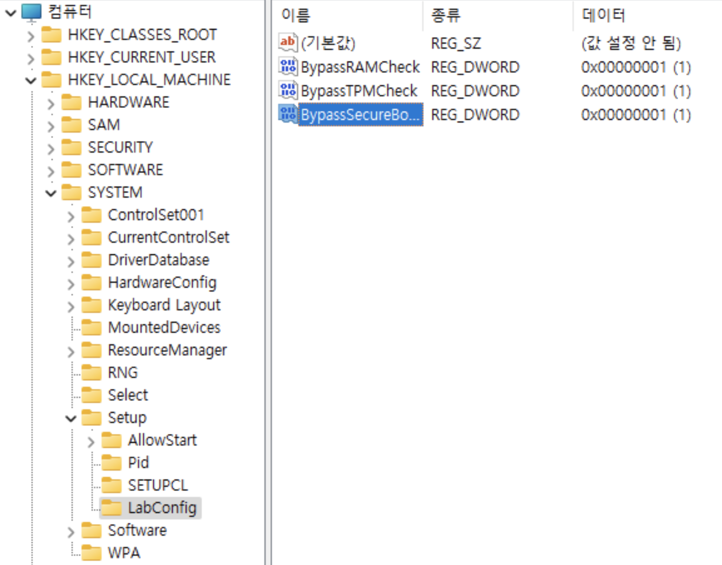 값 이름 : BypassSecureBootCheck 값 데이터 : 1