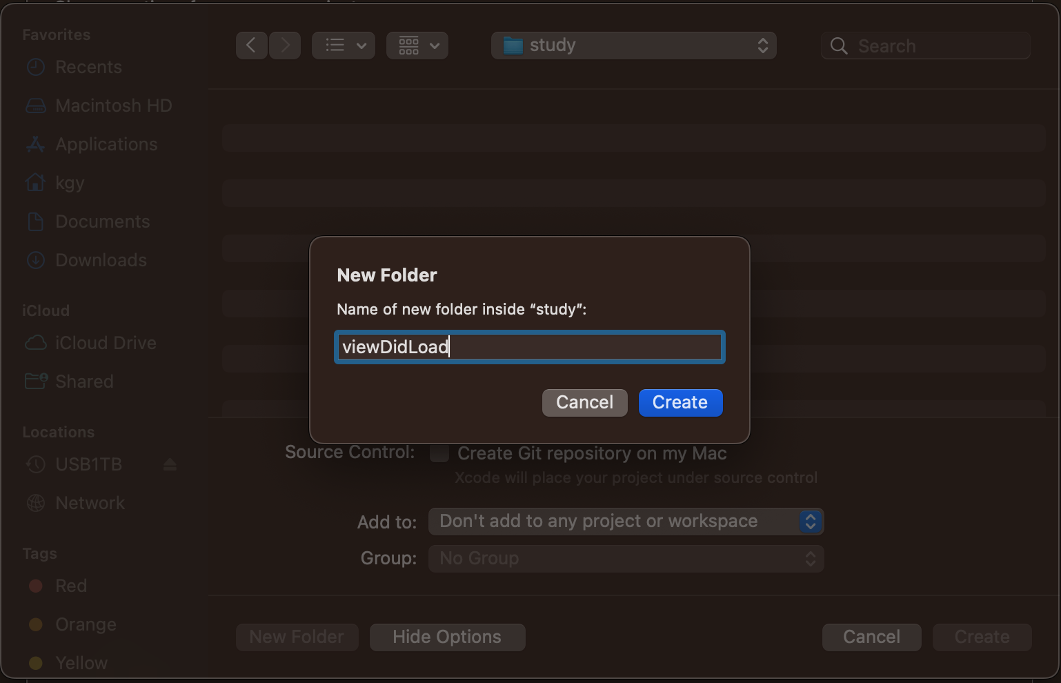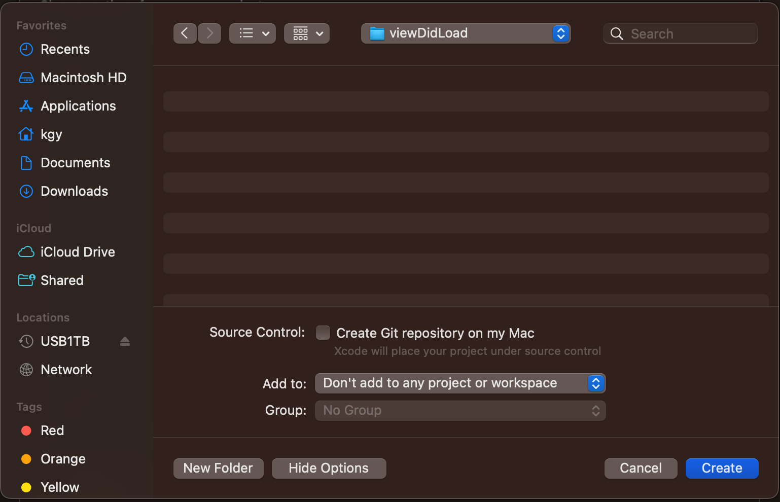 저는 여기서 [New Folder] 버튼을 클릭하여 viewDidLoad 라는 폴더를 생성 한 후 그 안에 프로젝트를 생성하여 진행 할께요. 여러분도 알맞은 폴더 위치에 프로젝트별로 폴더를 생성하셔서 진행하시면 좋으실 것 같아요.
