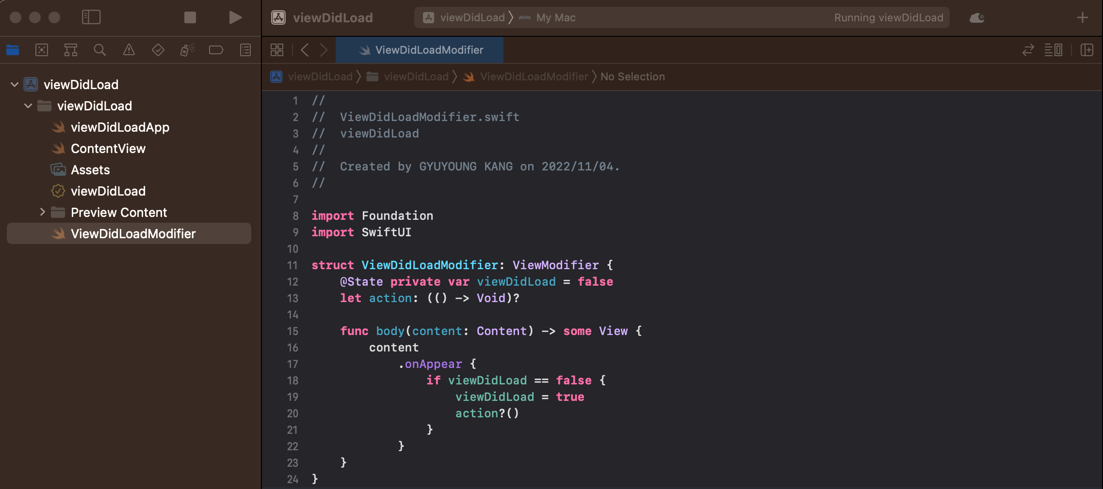 SwiftUI 에서 기본적으로 제공하는 ViewModifier 라는 protocol 이 있는데요. 우리는 이것을 이용해서 ViewDidLoadModifier 라는 우리만의 struct 를 만들거예요. struct 를 직역하면 "구조" 라고 해석하면 되실 것 같아요.