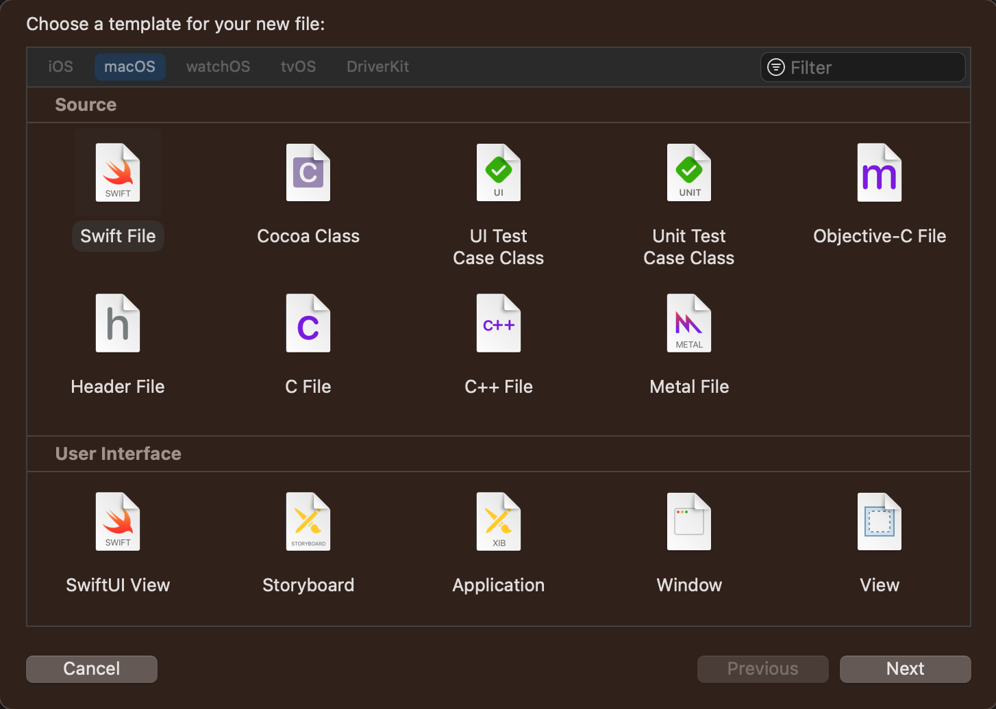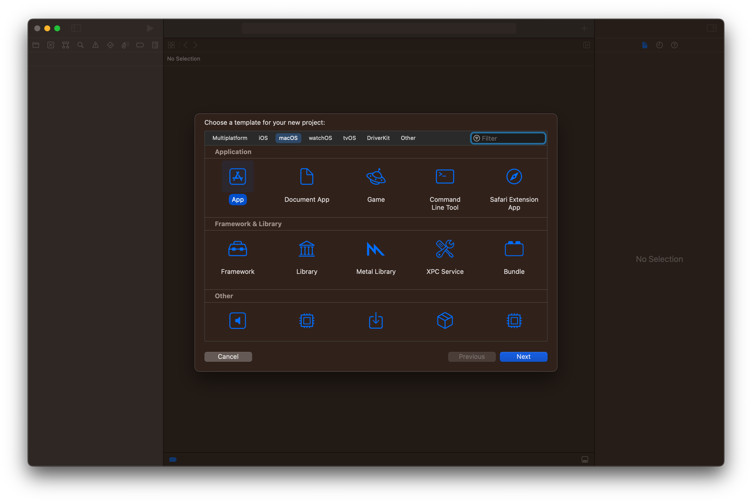 다음과 같은 프로젝트의 탬플릿을 선택할 수 있는데요. 우리는 여기서 편의상 macOS 를 선택하도록 할께요. 참고사항으로 SwiftUI 를 사용할 수 있는 프로젝트에 적용되는 기술이기 때문에 다른 (예를 들어 iOS 등) 프로젝트를 만드셔서 진행하셔도 되는데요. 본 강좌에서는 구현 기술만을 배우는 것이기 때문에 macOS 를 선택하도록 할께요.