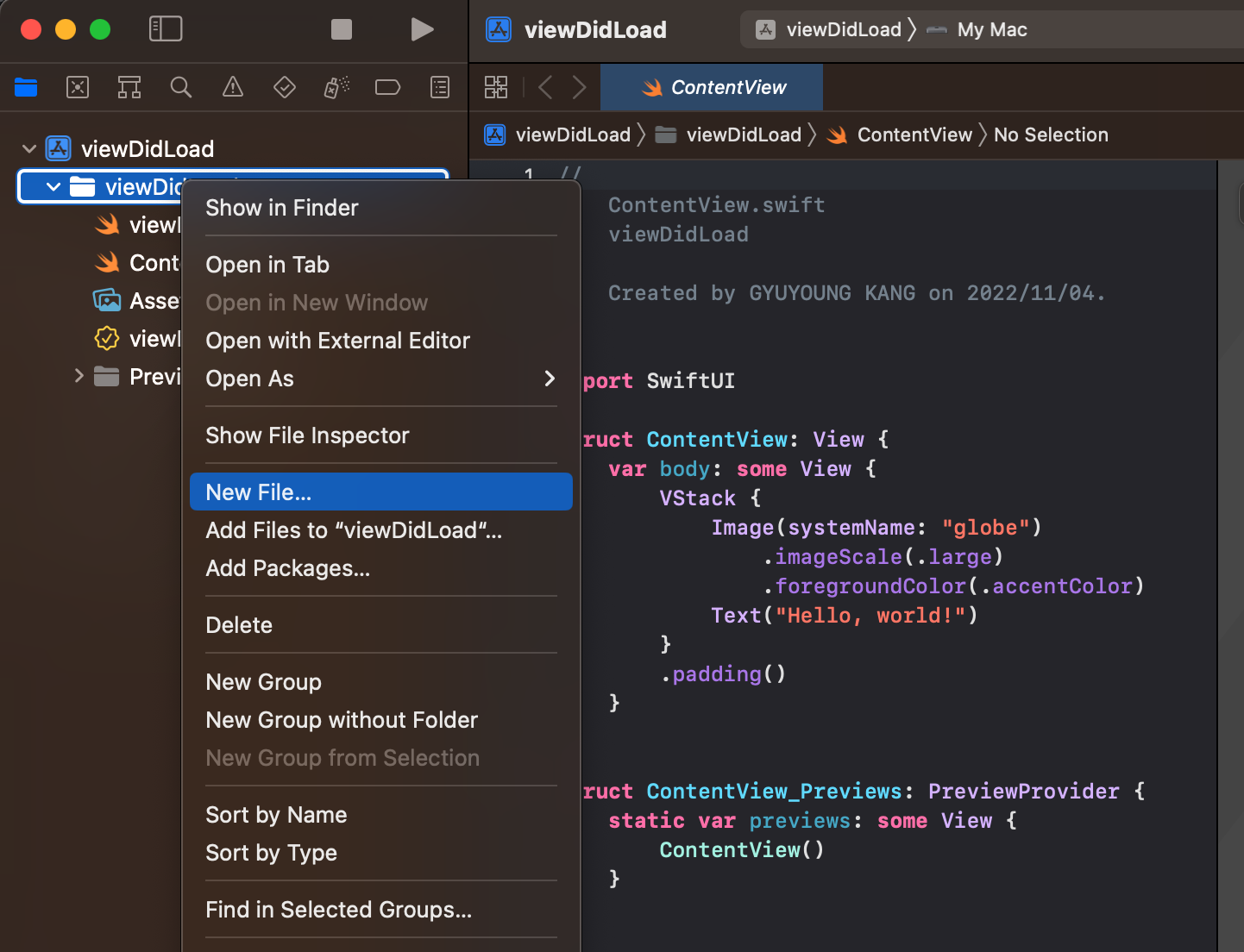 * 여기서 잠깐... 해당 폴더에 프로젝트 이름의 폴더가 자동으로 생성 되네요. 굳이 viewDidLoad 라는 폴더를 별도로 만드실 필요까지는 없어 보여요.