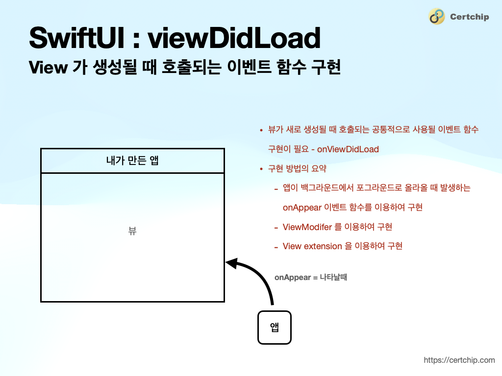 여기 오신분들이 가장 크게 궁금해 하시는 것이 아마도 앱을 만들때 가장 기본적으로 사용하시던 viewDidLoad 이벤트를 도대체 SwiftUI 를 이용할 때는 어떻게 해야 하지? 라는 것으로부터 시작되었을 거예요. 즉, 이미 애플용 앱을 많이 만들어 보신 개발자 분들일 것이라는 거죠.