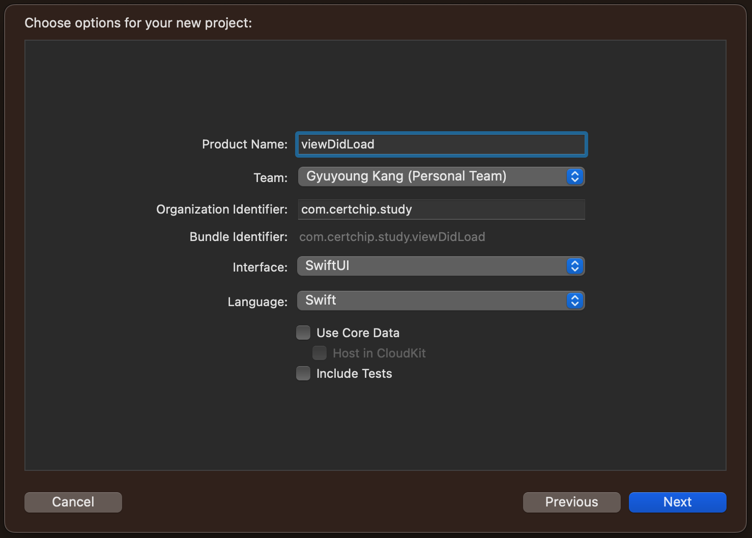 Interface 는 SwiftUI 를 선택하시고요. Language 는 Swift 를 선택하고 진행 하실께요. 또한, Use Core Data 및 Include Tests 는 체크 오프 하도록 할께요. 필요하신 분은 체크 온 하셔도 본 강좌에서 별다른 영향이 없다는 것을 말씀 드릴께요.
