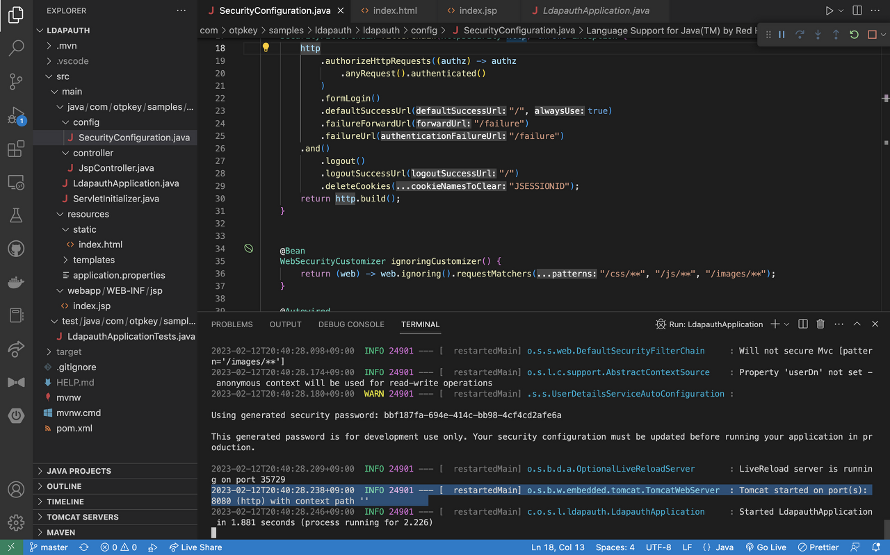 이 프로젝트는 계정 인증에서 LDAP 서버를 연결하며 Spring Security 에서 기본으로 제공하는 로그인 화면을 이용하여 로그인을 성공해야 웹 컨텐츠( index.html, index.jsp) 를 확인 할 수 있도록 구현되었습니다.