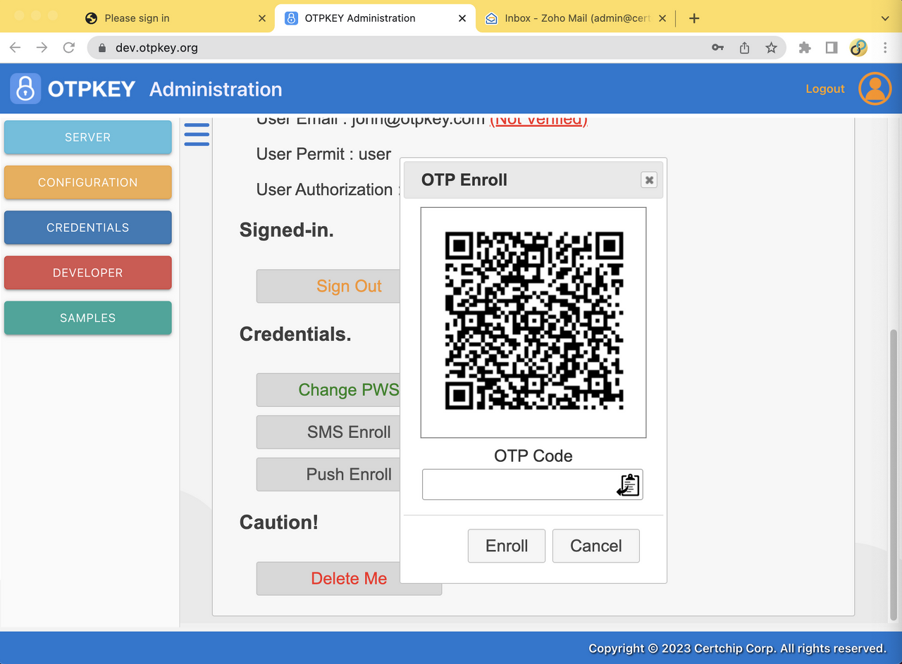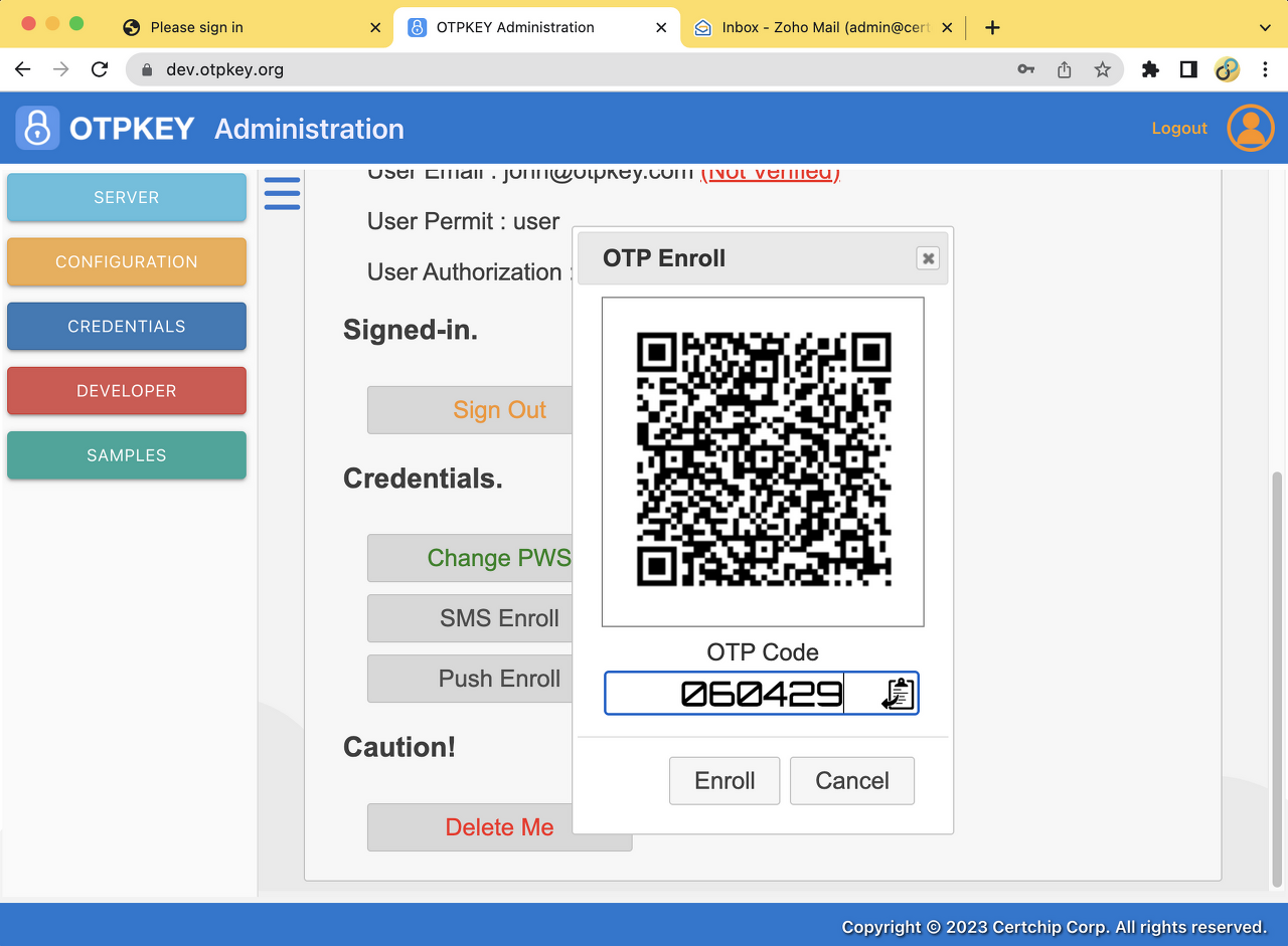 OTPKEY 인증앱에 등록된 OTP 인증 카드에 표시되는 OTP 코드를 웹 화면의 OTP Code 에 입력한 후 [Enroll] 버튼으로 등록합니다.