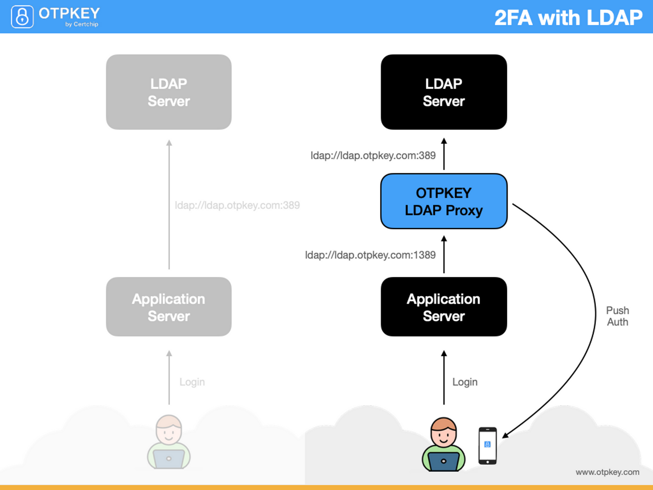 우리는 다음과 같이 Application Server (예; Tomcat) 와 LDAP Server (예; OpenLDAP) 사이에 OTPKEY LDAP Proxy 를 추가하는 방법으로 2차인증 (이 문서는 Push 인증을 적용) 을 구현할 수 있습니다.
