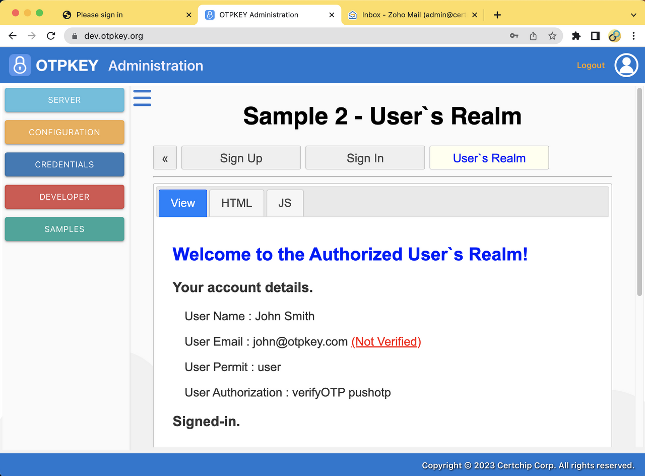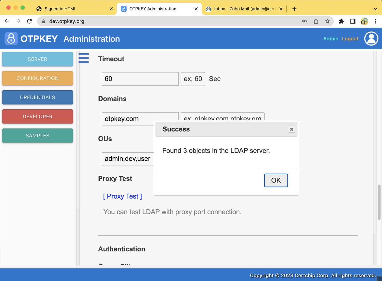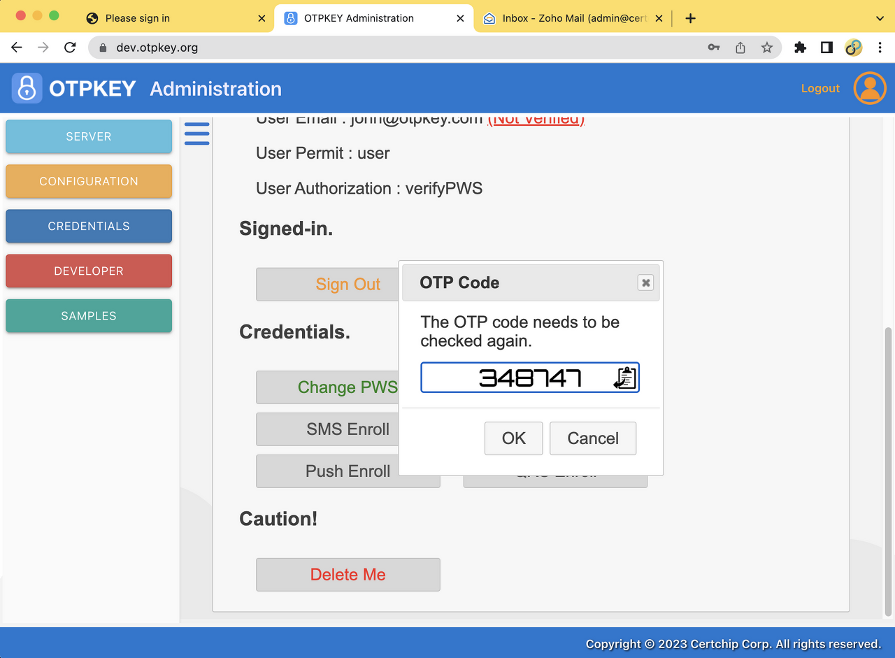 OTPKEY Administration 의 [ SAMLES ] 메뉴에서