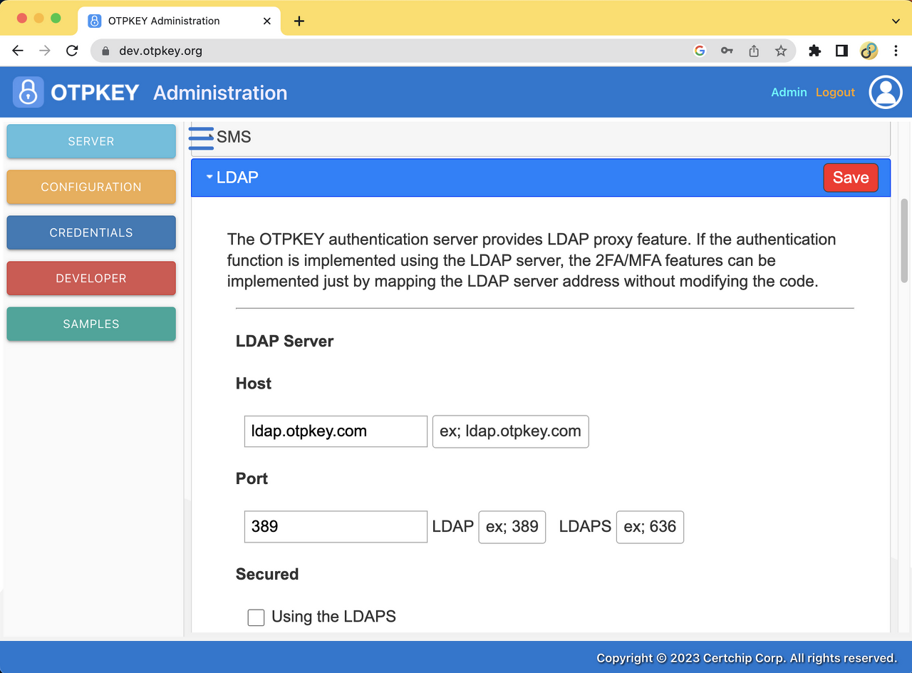 OTPKEY Authentication Server 의 Administration 화면에서 [CONFIGURATION] 메뉴의 LDAP 섹션을 채우고 Save 합니다.
