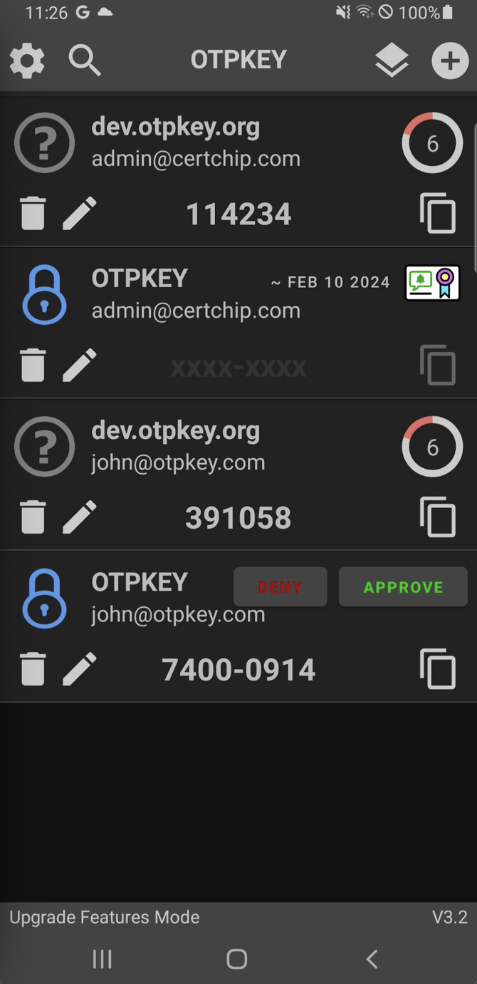 다음과 같이 OTPKEY 인증앱에 등록된 Push 인증 카드의 인증코드는 XXXX-XXXX 형식으로 표현되며 승인 대기중인 Push 인증 카드는 [DENY] [APPROVE] 버튼이 표시됩니다.