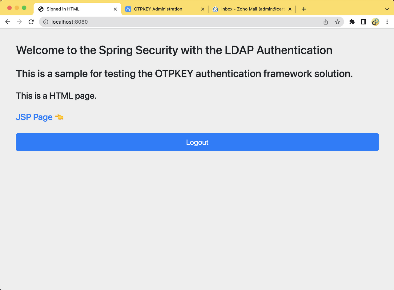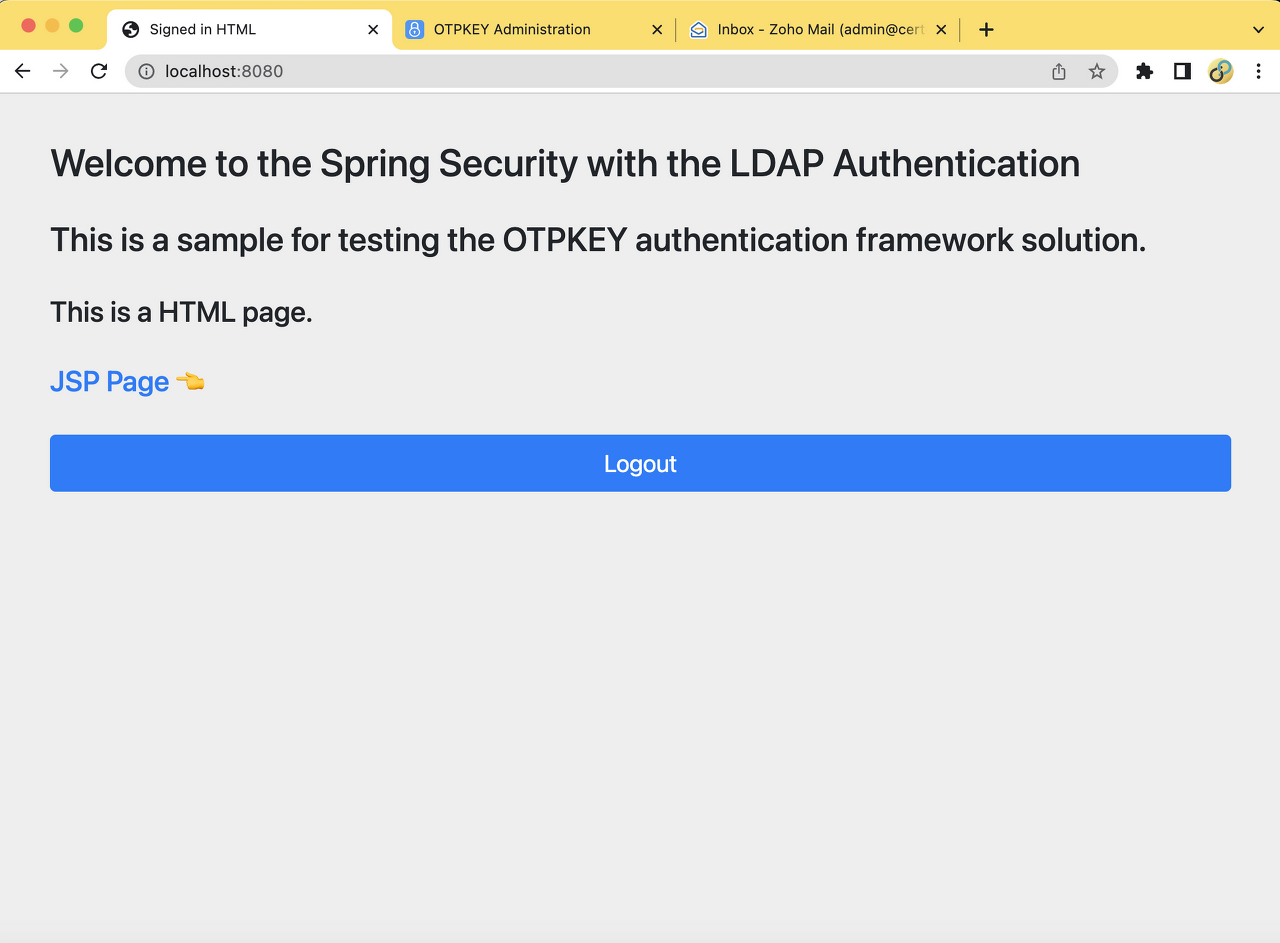 계정 (john@otpkey.com) 과 암호를 입력하여 LDAP 서버로부터 승인되면 다음과 같이 로그인 된 화면을 표시합니다.